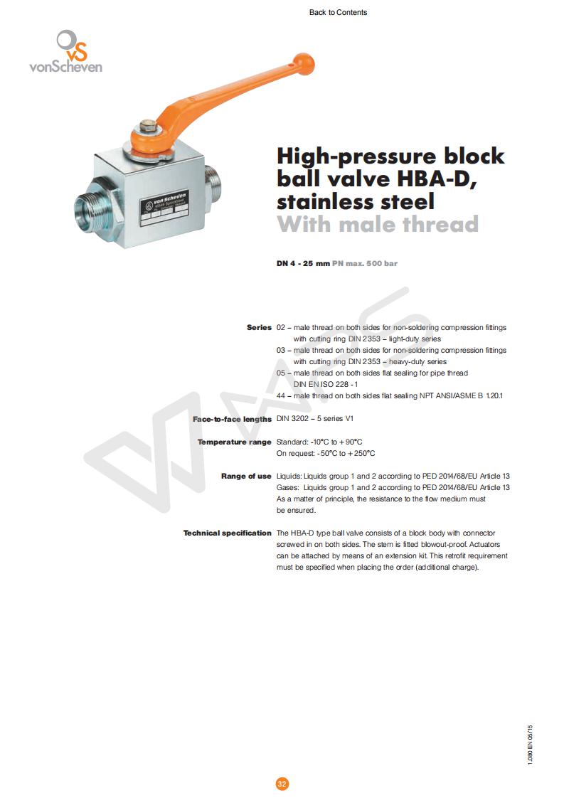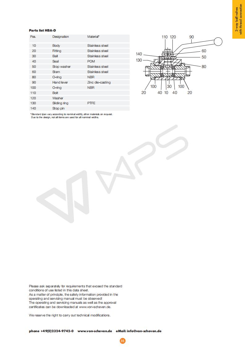 德國von scheven是歐洲著名的球閥制造商,是一家有80多年歷史的家族企業。德國von scheven的產品取得德國TUV認證、ISO9001認證、AD-2000認證、DGRL97/23/EG、TA-Luft認證、TEPD認證、GWI認證、VDS認證、DVGW認證、SVGW認證、俄羅斯EAC認證 技術說明:NBA-D型球閥由兩側螺紋連接的閥體組成。主軸防吹出設計。可以加裝執行器連接套件。訂購時必須指定這種改裝(額外收費)。 使用條件超出本數據表中列出的標準要求的,請另行咨詢; 必須始終遵守操作和維護說明,特別是安全說明;  |